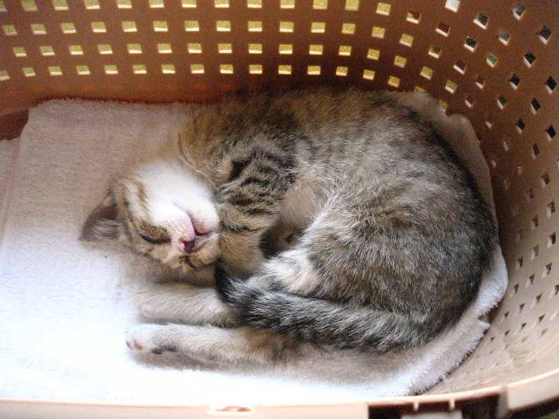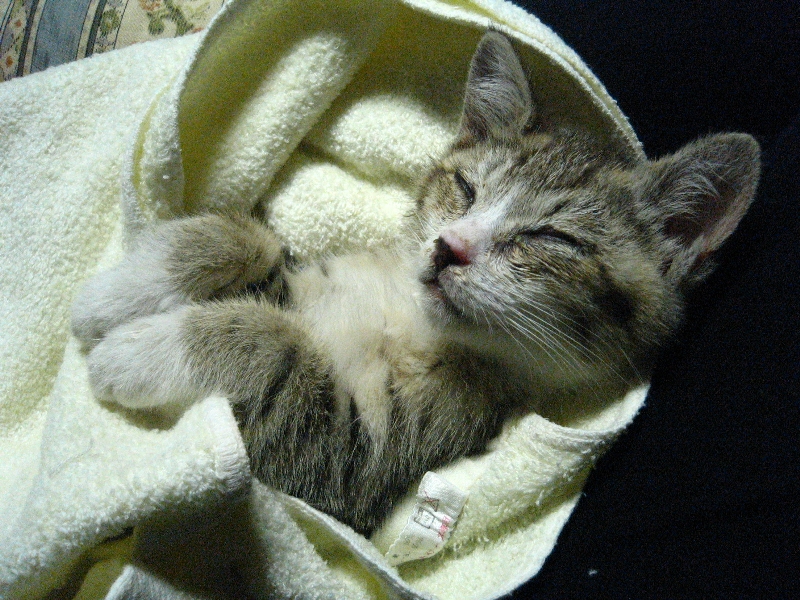 子猫はかなり弱っていたので「ダメもと」覚悟で実家に保護し、ユミ先生から抗生物質と目薬をいただき、高栄養ネコ缶を購入し、つきっきりで看病することに。昼夜問わず、数時間ごとに水と餌を無理矢理飲ませ、汚れを拭き投薬をすること丸2日。実家の玄関脇の部屋で過ごしていましたが、「一晩ももたないんじゃないか?」と言われていた子猫が寝てばかりいるとはいえ、まだ息をしていることにホッとし、夏でも涼しい別荘地にある自宅に連れて帰り、本格的に看病することになったわけです。
